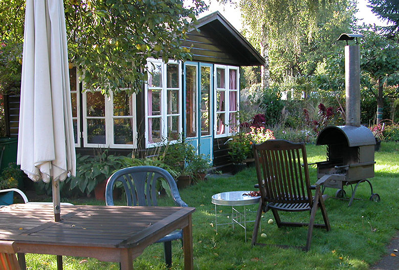 Erst als wir das Gartenhäuschen hatten wurde uns klar, wie wenig Freizeit wir bisher "unten" verbracht haben. Wir wohnten ja in der 1.Etage. Langsam aber sicher richteten wir uns unten mit Gartenmöbeln und Gartenkarmin häuslich ein und nutzten das Häuschen bei heißem Wetter sogar zum schlafen. |