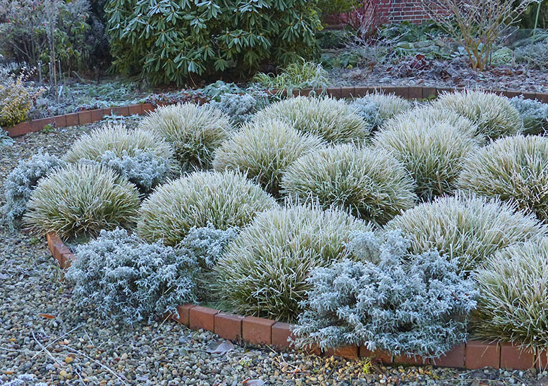 Sesleria autumnalis mit Raureif. Die Grashorste wurden vom