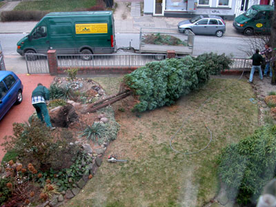 Die Konifere wird gefällt und hinterlässt eine große Lücke auf dem