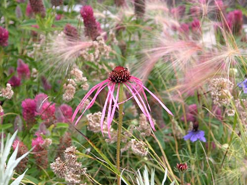 Echinacea zwischen Mähnengeaste und verblühter Schneemarbel ....