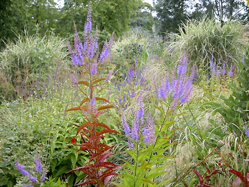 Kandelaber-Ehrenpreis (Veronicastrum) vor Miscanthus sinensis variegata